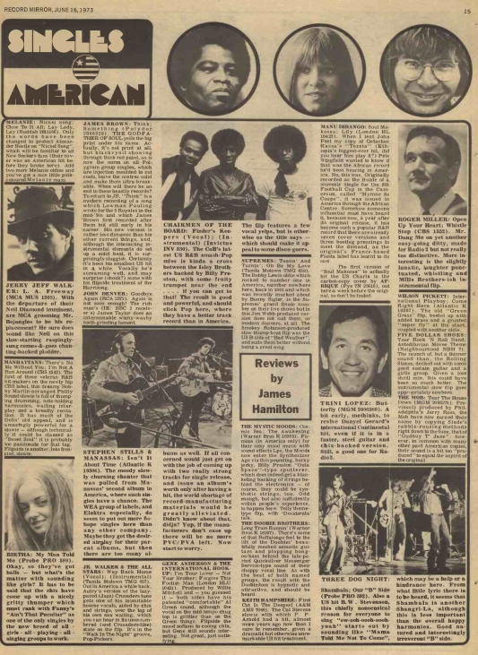 Are these the “Happy Feet Time” Montclairs? Their first R&B hit for years, this Oliver Sain co-production is a wailing slowie which starts with a muttered rap over a sexily soaring sax before the lead singer emotionally swoops through the lush strings, sax and group backing. Old-fashioned and smoochy in sound, it’s almost a throw-back to the late ’60’s. Continue reading “June 30, 1973: Bobby Womack, S.O.U.L., The Montclairs, Bill Withers, Don Covay”