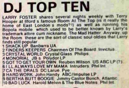 Detroit Spinners ‘Cupid’ is also on 12in, while Bob Marley’s 12in flip includes the bonus 63bpm ‘Ride Natty Ride’ . . . Dave Grusin’s direct-cut Japanese import LP on JVC is getting big for jazz jocks, but I’ve yet to hear it as Groove don’t demonstrate direct-cuts as they’re so expensive! . . . Whitehaven Whitehouse got their Sunday licence back and celebrate with an all-dayer on August 3rd starring Chris Hill, Jeff Young, Pete Haigh, Frenchie and the resident jocks – see you there! . . . Jeff Young starts a weekly live jazz night this Sunday (22) at Dartford Flicks, starring Reg Webb’s Fusion . . . Flicks’ VE night last week was fun, but Robbie Vincent’s fascinating World War II tape did seem to last a week! . . . Erskine T (Thompson) is now Arista’s disco plugger, at 01-491 3870 on Mon/Tuesday Pete Haigh & Frenchie, rapidly expanding their activities from Caton Scarthwaite, are now part of a Northern funk mafia known as The Team and including Eric Hearn (Liverpool), Billy (Standish Cassinellis), Neil Neile (Stoke/Nottingham), Pete Girtley (Sheffield) and the Rumours funk night jocks . . . Darryl Hayden claims Yellow Magic Orchestra broke first at February’s Slough allniter and thanks the Richmond Cheekee, Pete’s “funk invaders” for first adopting it as their theme tune – however Mark Cotgrove writes from Southend to say “although I’m ashamed to admit it, I started the Zero 6 “space invader” dance (damn it)!” – anyone else for instant fame? . . . Colin Curtis thinks there were about a thousand Northerners at Knebworth and says the alldayer that he and John Grant returned for was down in numbers noticeably by 500 or so . . . Kev Hill funks – and he really does mean funks – a barbeque at the South Weald Flower Festival in Brentwood next Saturday (28) and advises £2.50 tickets covering food as well are available from him (send SAE) at 65 London Road, Brentwood CM14 4NN . . . Chris Britton is selling some rare disco 12in promos and pop collectors items, lists from him at 16 Portland House, Arnison Avenue, High Wycombe, Bucks . . . Ralph Tea, Marious Cee & Nigel RA See work in Fleet Street and in their spare time have put together a regular and rather hip jazz-funk fanzine called Groove Weekly which though skimpy is well worth seeing – Ralph also runs a jazz-funk disco around Watford, so for more details call him on Rickmansworth 77774 (presumably evenings) . . . Arbie is back at Retford MAYC, cos the wally jock who replaced him evidently lost over half the audience! . . . Pete Tong, whose West Kingsdown Hilltop jazz-funk night is every Monday, joins Dave Brown on BBC Radio Medway this Friday (20) from 7-8pm . . . Martin Collins now can be found behind the counter at Groove . . . Gary Oldis reports that Geordies are chanting “why aye” to Cameo’s ‘On The One’ at Aycliffe Gretna Green . . . Steve Dennis says that the alternations at Edgbaston Profile Suite will double the size and update his room . . . Sammy DeHavilland whispers that Halesowen Libertys manager Steve Lefearve was wearing a Saturday Night Fever badge! . . . SEDA have a little wine and cheese party in Chilham next Sunday, which could be pleasant if the weather’s good . . . Diana Ross’s remix of her Nile Rodgers & Bernard Edwards-produced LP‘s far from their own original version, which had a fuller-fleshed Chic texture – and its thinness is indeed annoyingly evident if you mix it out of something beefier . . . Teena Marie’s 7in might just as well be a different record, amazingly leaving out all the most distinctive features of the full version! . . . One Way ‘Pop It’ is another good mix out of Tom Browne ‘Funkin’ For Jamaica’ . . . Brian Brindle (Chelsea Alibi) sez that Change ‘Searching’ isn’t difficult to get into, he merely wacks up the volume on the intro and for all those who leave the floor, double enter it . . . DJ Donald seems to be getting less rock and more disco-orientated up in the Berwick/SE Scotland area, and probably starts a local paper review column soon . . . Paul “Wiggy” Wignall (Liverpool Oscars) is the latest Merseysider to complain at the lack of a proper import outlet there . . . Chart contributors and potential contributors, please note that our deadline is Wednesday/Thursday, so get ‘em in by then if possible (on your own paper – there are no printed forms) to James Hamilton, Record Mirror, 40 Longacre, London WC2 . . . KEEP IT FUNKY!