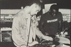 SLEEPING BAG Records held a roof party above their Manhattan office at 67th & Broadway during the New Music Seminar, and the DJ up on the roof was none other than an unheralded MANTRONIK, caught here cueing up some hot “house” on the Trax label!