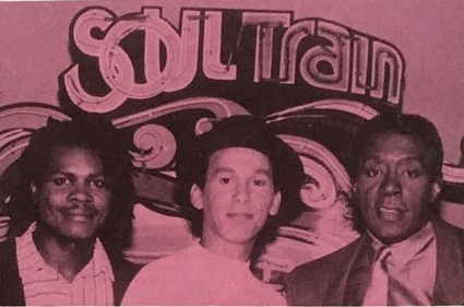HINDSIGHT recently visited the US to promote their debut single there, and while being interviewed on Stevie Wonder’s radio station KJLH were overheard by TV presenter Don Cornelius saying that their biggest ambition was to appear on his show, ‘Soul Train’ (a weekly black music dance party with a few lip-synched PAs). “Find those guys!”, legend (and the press release) would have us believe Cornelius shouted, and the upshot was that they did indeed appear on the May 21st edition, coast to coast across the States. Henri Defoe and Camelle Hinds ore here seen looking happy with Don Cornelius to prove it!